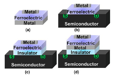 그림 4. 강유전체 소자 구조 (a) MFM capacitor, (b) MFS 구조, (c) MSIF 구조, (d) MFMIS 구조 [17]