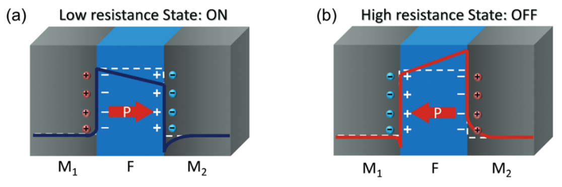양단에 전계가 인가될 때 극성에 따라 분극 역전에 의한 potential barrier의 크기가 변하고, 이에 따른 터널링 전류가 변화하는 현상을 Tunneling Electroresistance(TER)라 한다. FTJ 소자는 전기장을 가해 메모리 상태를 변경하며, 전기저항 차이를 통해 데이터를 저장하고 읽을 수 있다. 높은 속도의 프로그램/삭제 공정, 저전력 구동, 시냅스 구동이 가능한 비휘발성 메모리로 응용되며, 단순한 구조로 고집적화 배열 적용이 용이하다.[13]