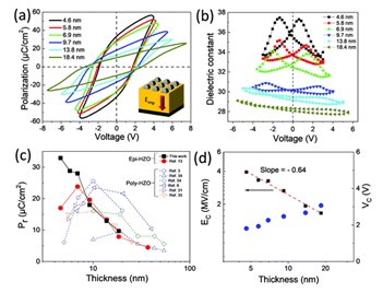 그림 6. 강유전체 소자의 박막 두께 변화에 따른 (a), (c) 잔류분극 및 (d) 항전기장 변화 [18]