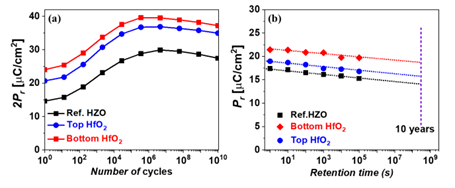 그림 7 강유전체 소자의 상하단 HfO2 유무에 따른 (a) Endurnace 및 (b) Retention 변화 [19]