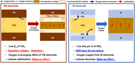 기본적으로 이러한 연구의 주 목적은 열처리 이후 HfO2 기반의 강유전성 박막의 o-phase를 지배적이고 균일하게 확보하는 것을 목표로 한다. 박민혁 교수 연구팀은 2023년 강유전층/금속층 계면에서의 산화에 기반한 t-phase 발생 및 wake-up 현상을 감소시키고자 강유전체 소자에서 가장 널리 쓰이는 TiN(Titanium nitride) 박막을 대신해 W(Tungsten) 박막을 상하부 전극물질로 사용하여 Endurnace 특성을 개선하였다. [20]