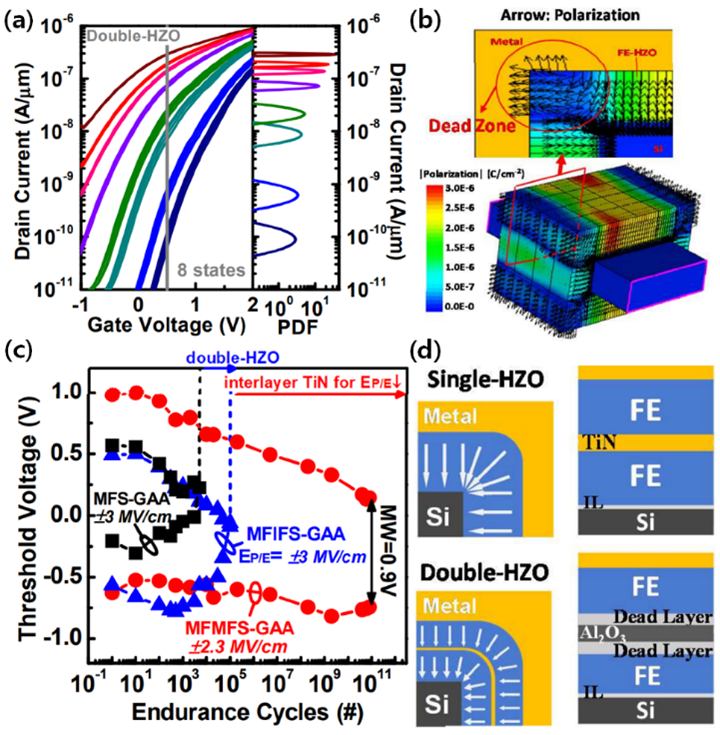 그림 9 (a) 이중 HZO 층을 사용하여 구현한 3bit Id-Vg 거동, (b) GAA 구조를 사용할 때 발생되는 모서리 부분의 불균일한 전계 및 분극 감소 현상 TCAD 시뮬레이션 (c) 이중 HZO 층이 사용된 소자의 MW 및 endurance 특성 (d) 이중층이 사용될 경우 기대할 수 있는 전계 재분배 현상 모식도 [21]
