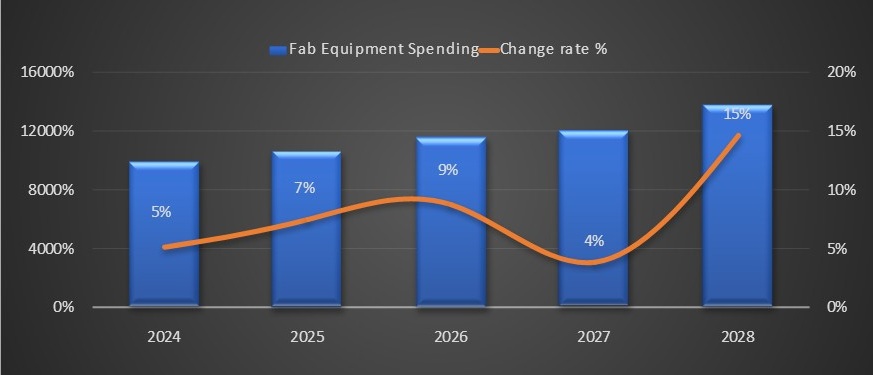 전 세계 300mm 팹 장비 투자는 올해 사상 처음으로 1,000억 달러를 돌파할 것으로 예상되며, 전년 대비 7% 증가한 1,070억 달러에 이를 전망이다. 이어 2026년 9% 증가(1,160억 달러), 2027년 4% 증가(1,200억 달러), 2028년 15% 증가(1,380억 달러)가 예상된다.