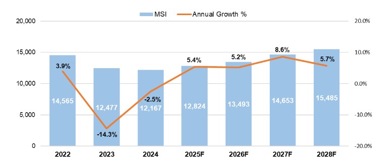 한편, SEM는 2025년 글로벌 실리콘 웨이퍼 출하량이 전년 대비 5.4% 증가한 128억 2400만 제곱인치에 이를 것으로 전망되며, 지속적인 성장세를 이어가 2028년에는 154억 8500만 제곱인치로 업계 사상 최고치를 경신할 것으로 예상된다고 밝혔다.