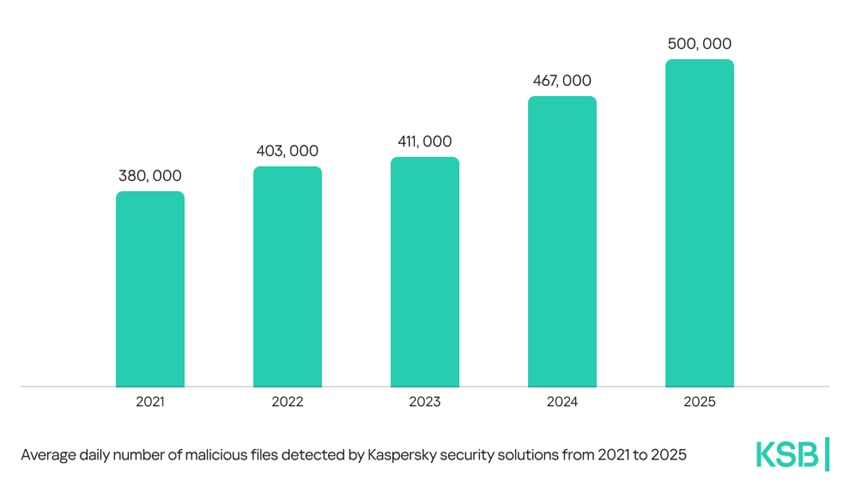 카스퍼스키(지사장 이효은)는 12월 31일, 사이버 보안 주요 트렌드를 분석한 ‘연례 카스퍼스키 보안 보고서(KSB, Kaspersky Security Bulletin)’를 발표했다. 카스퍼스키 탐지 시스템은 2025년 하루 평균 500,000개의 악성 파일을 발견했으며, 이는 전년 대비 7% 증가한 수치이다. 여러 유형의 위협이 전 세계적으로 증가했는데, 패스워드 탈취형 악성코드는 59%, 스파이웨어는 51%, 백도어 탐지는 2024년 대비 6% 증가했다.