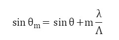 θm은 산란된 빛의 출사 각도, θ는 입사된 빛의 입사 각도, λ는 입사된 빛의 파장, Λ는 grating 주기, m은 산란된 빛의 차수로 정수 값이다. 왼쪽 그림은 grating 구조에서 빛의 입사, 반사를 나타낸 것이고 오른쪽 그림은 산란된 빛의 차수에 따른 산란 양상을 나타낸 것이다. grating 구조를 사용해서 기존보다 더 나은 광 추출 효율을 얻기 위해서는 m 값은 0 또는 1이 되어야 한다. 여기에 grating 주기, Duty Cycle, grating 깊이, grating 각도 등이 격자 구조에서 광 추출 효율에 영향을 준다.