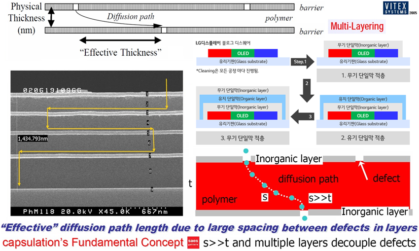 다층 박막 encapsulation 기술은 OLED 구조에서 음극까지 증착한 후, 무기물과 유기물 층을 위와 양 옆으로 번갈아 증착하는 방식을 말한다. 마치 박막이 겹겹이 쌓여 있다 하여서 박막 기술이라 일컫는다. 여기서 수분과 산소를 막아 수명을 늘리는 주된 역할은 무기물 층이 담당한다. 산소, 수분 침투 차단을 위해선 나노 크기의 핀 홀이 없어야 하고 산소, 수분 투과 차단을 위해선 산소, 수분에 대한 용해도와 확산 계수가 낮아야 한다. 각 상황에 따라 적절한 소재를 선택해 사용한다. 유기물 층도 여러 역할을 한다. 무기물 층의 연속 증착에 따른 응력를 완화하여 표면에 균열이 발생하지 않게 하고 유기물의 리플로우(reflow) 특성을 통해 표면을 평탄하게 하여 후속 공정을 용이하게 한다. 또한 잉크젯 공정에선 오염물을 덮어주는 역할을 하며 패터닝이 가능하고 재료 사용 효율이 좋다. 그리고 플라스틱 기판에선 유연성을 더 극대화해준다. 이런 이유들로 ‘무기층-유기층-무기층’ 형태의 구조로 다층 박막 encapsulation가 구성된다.