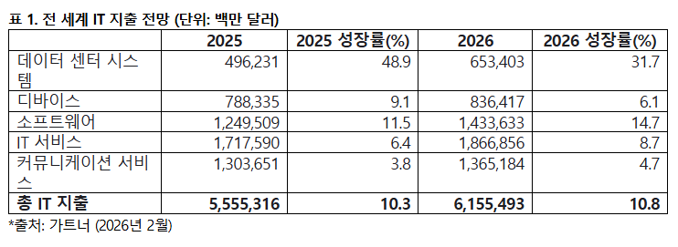 가트너(Gartner)는 2026년 전 세계 IT 지출 규모가 전년 대비 10.8% 증가한 6조1,500억 달러(약 8,961조 원)에 이를 것으로 전망했다.