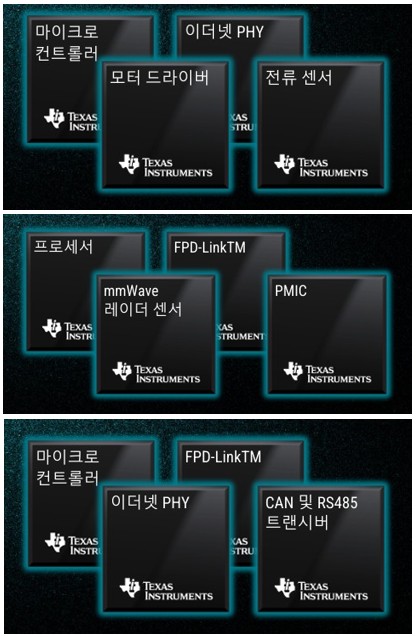 로보틱스 분야를 지원하는 TI의 다양한 솔루션(위에서부터 모터제어, 센서퓨전, 통신 솔루션)