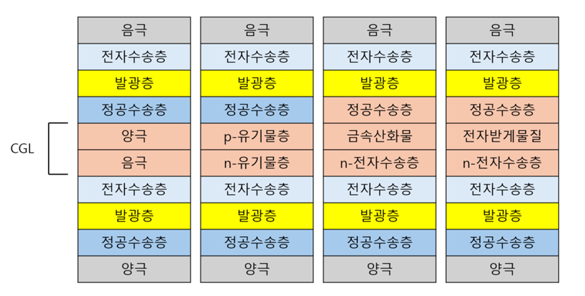 이러한 구조를 통해 탠덤 OLED는 동일한 전류 조건에서 더 높은 휘도를 구현할 수 있으며, 발광층 내 여기자 밀도를 효과적으로 분산시켜 효율 저하와 소자 열화를 완화할 수 있다. 본 장에서는 탠덤 OLED의 기본 구조와 작동 원리를 설명하고, 단일 스택 OLED와의 구조적 차이를 중심으로 그 특성을 정리한다.