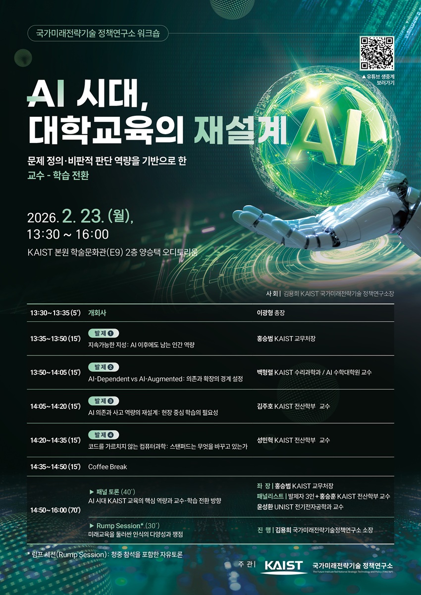 이번 행사는 KAIST 국가미래전략기술 정책연구소(소장 김용희)가 주관하며, AI 시대 대학의 역할과 책임을 재정립하기 위한 자리이다고 KAIST 측은 설명했다. 워크숍에서는 KAIST 교무처장과 교수진이 AI 시대 교육 변화 방향을 발표하고, UNIST 교수가 참여하는 패널 토론을 진행한다. 또한 학생과 시민이 자유롭게 참여하는 ‘럼프 세션(Rump Session)’을 통해 AI 전환(AX) 시대에 개인이 무엇을 배우고 어떻게 준비해야 하는지 폭넓게 논의할 예정이다.