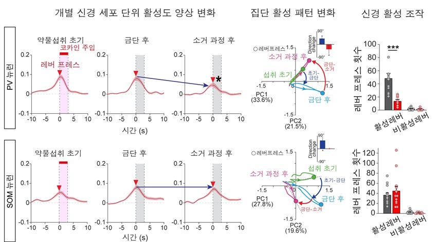 연구팀은 신경 활동을 인위적으로 조절해 PV 세포의 활동을 억제하자 쥐의 코카인 탐색 행동이 크게 감소하는 것을 확인했다. 반대로 이 세포를 활성화하면 소거 과정 이후에도 약물을 다시 찾는 행동이 지속됐다. 이러한 효과는 설탕물과 같은 일반적인 보상에는 나타나지 않았으며, 마약 중독 행동에서만 특이적으로 관찰됐다. 이는 같은 억제성 신경세포인 소마토스타틴(SOM) 세포에서는 나타나지 않는 현상으로, 파발부민(PV) 세포가 마약 중독 행동을 선택적으로 조절한다는 점을 보여준다는 설명이다.