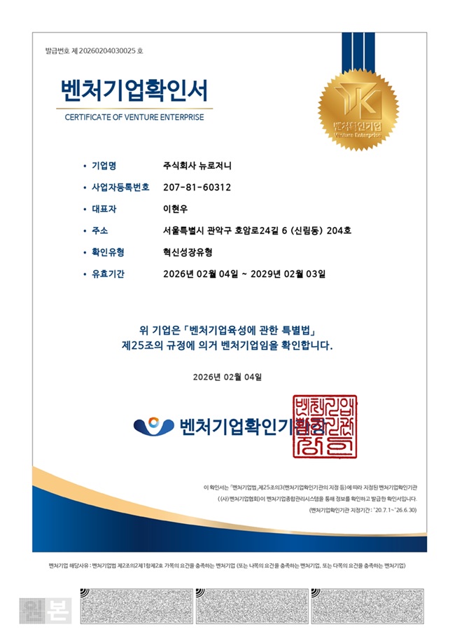 뉴로저니(대표 이현우)가 기술력과 성장 가능성을 인정받아 벤처기업 인증을 획득했다고 밝혔다.