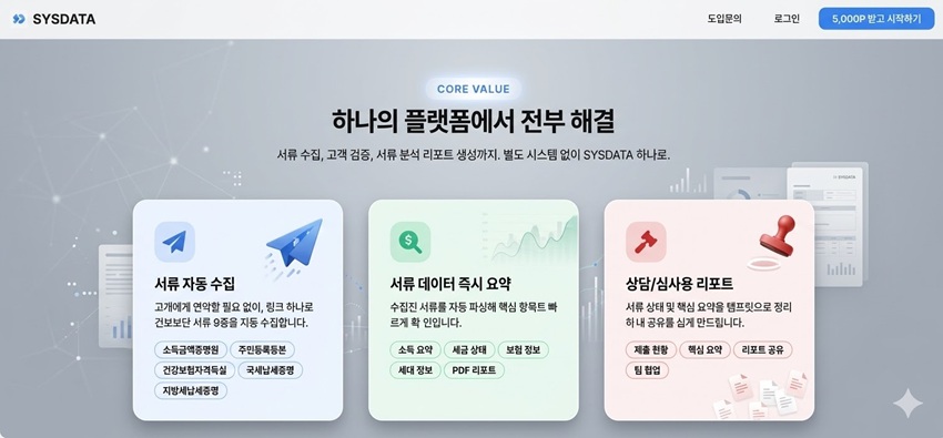 시스데이터는 고도의 컴플라이언스가 요구되는 금융, 법무, 온투업 등의 산업에서 반복되는 수동 서류 검증 업무를 웹에서 즉시 처리해 주는 버티컬 AI(Vertical AI) 플랫폼이다. 관리자가 발송한 링크를 통해 고객이 간편인증을 완료하면, 필수 서류 9종을 3분 이내에 자동으로 수집한다. 이후 부동산 등기부, 자동차등록원부 등 자산과 리스크를 실시간으로 분석하여 심사역이 즉시 판단 내릴 수 있는 종합 PDF 분석 리포트를 자동으로 생성한다는 설명이다.