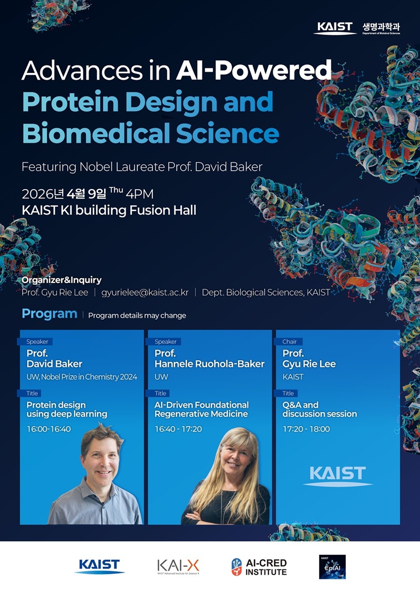 한편 KAIST는 David Baker 교수의 방한을 계기로, 4월 9일(목) 오후 4시 KI 빌딩 퓨전홀에서 Hannele Ruohola-Baker 교수(한넬레 루오홀라-베이커, 미국 워싱턴대학교)와 함께 ‘Advances in AI-powered protein design and biomedical science(인공지능 기반 단백질 설계 및 생의학 연구의 최신 동향)’를 주제로 강연을 개최할 예정이다. 본 행사는 KAIST 해외 석학 초빙 교수 지원 사업, KAI-X, InnoCORE AI-CRED 혁신신약단, 그리고 과학기술정보통신부 해외우수연구기관협력허브구축 사업의 지원으로 진행된다.