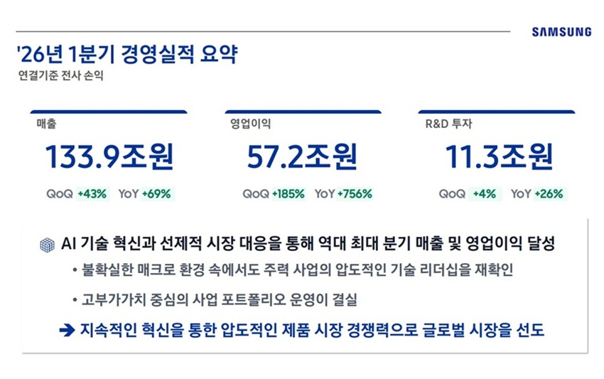 삼성전자는 2026년 1분기 연결 기준 매출 133.9조원, 영업이익 57.2조원을 기록하며 역대 최대 분기 실적을 달성했다고 밝혔다.