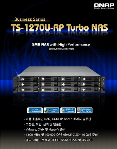 - 합리적인 가격의 10GbE 처리 속도를 제공하는 NAS, Turbo NAS TS-x70 제품군 출시: TS-x70 제품군은 12-베이(12개 HDD 장착 가능) TS-1270U-RP 및 8-베이 TS-870U-RP 등으로2칸의 랙(rack)차지하는 2U 크기의 랙 마운트 규격으로 설계되어 차곡차곡 쌓아 쓰도록 만들어진 SMB용 제품이다. 특히 고성능을 제공하는 합리적 가격의 제품으로 듀얼 코어 인텔(Intel®) 2.4GHz 프로세서가 탑재되어 있다.