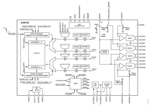 아나로그디바이스는 복합 파형 발생 기능을 위해 온칩 SRAM(static random access memory)과 DDS(direct digital synthesis)를 통합한 AD9106 쿼드-채널 12비트 및 AD9102 단일-채널 14비트 D/A 컨버터를 발표했다. 신형 D/A 컨버터는 초음파 트랜스듀서 여기(excitation), 의료용 측정장비, 휴대형 측정장비, 신호 발생기, 임의파형 발생기(AWG) 등과 같은 애플리케이션에서 요구되는 높은 동적 범위의 고속 멀티채널 복합 파형을 발생한다. 온칩 DDS는 24비트 튜닝 워드로 최대 180 MHz까지 동작하여 10.8 Hz/LSB(최소유효비트) 주파수 분해능을 지원하며, 모든 D/A 컨버터에 대해 단일 주파수 출력을 제공한다. 또한 각 D/A 컨버터에 대해 독립적으로 프로그래밍이 가능한 위상-변이(phase-shift) 출력을 제공한다. 패턴 데이터는 직접 생성되어 SRAM에 저장된 파형, SRAM에 의해 진폭 변조된 DDS 출력, 그리고 처프(chirp) 또는 주파수변이변조(FSK) 기능을 제공하는 SRAM의 DDS 주파수 튜닝 워드 등을 포함한다. 사용자들은 내부 패턴-제어 상태 머신을 통해 모든 D/A 컨버터에 대한 패턴 주기, 각 D/A 컨버터 채널의 신호 출력을 위한 패턴 주기 내의 개시 지연, 패턴 반복률(repetition rate) 등을 프로그램할 수 있다.
