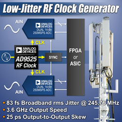 아나로그디바이스의 새로운 ‘AD9525’ RF 클록 IC는 245.76MHz일 때 외부 VCO(voltage-controlled oscillator)로부터의 지터 영향을 포함해서 83fs의 절대 광대역 rms(root-mean square) 지터(1kHz~100MHz 오프셋 범위)를 가지고 있다. 이 새로운 RF 클록 IC는 경쟁사 제픔과 비교해서 약 3배 더 빠른 최대 3.6GHz 출력 속도를 지원한다. 이와 같이 높은 속도와 낮은 지터 성능을 결합함으로써 GSPS(billions of samples per second) 대의 데이터 변환이 필요한 매우 정밀한 클록 합성을 필요로 하는 계측기 및 방위 장비 같은 애플리케이션에 이용하기에 특히 적합하다.