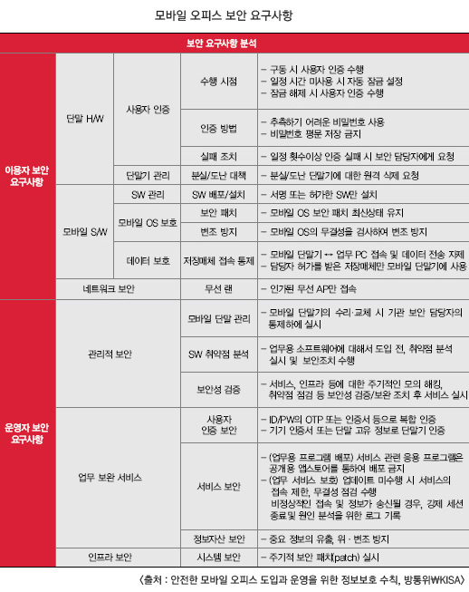 최근 방송통신위원회와 한국인터넷진흥원(KISA)은 기업의 모바일 오피스 도입/운영에 따른 보안 위협을 낮추기 위해 ‘안전한 모바일 오피스 도입과 운영을 위한 정보보호 수칙’을 발표했다. 방통위 관계자는 “모바일 오피스 보안수칙이 기업의 모바일 오피스 도입 및 운영에 큰 고민거리인 보안 문제를 해결하기 위한 출발점이 될 것”이며 “방통위는 모바일 오피스 환경과 기술 변화를 고려하여 모바일 오피스 보안 수칙을 주기적으로 수정/보완하고, 올해 상반기에는 모바일 오피스 정보보호 안내서를 개발 보급하는 등 모바일 오피스 보안을 지속적으로 강화할 계획”이라고 밝혔다.