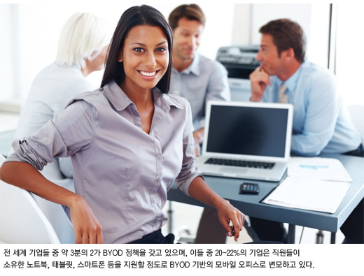 위와 같은 모바일의 보안 위협에도, 모바일 오피스는 다양한 분야에서 업무의 새로운 바람을 일으키고 있다. 특히 제조, 의료, 교육 등의 전문 분야에서 IT 기술을 접목한 모바일 오피스 환경은 생산성 및 서비스 향상 등의 기대효과를 주고 있다. 최근에는 스마트폰 시장과 처리능력이 향상됨에 따라 개인 소유의 모바일 장치가 증가하고 있으며, 이를 개인 용무 이외에도 업무에 활용하는 BYOD(Bring Your Own Device)가 나타나고 있다. BYOD는 사용자의 개인 단말기를 개인 용무 이외에 회사 업무에도 사용하는 정책으로써, 전 세계 기업들 중 약 3분의 2가 BYOD 정책을 갖고 있으며, 이들 중 20~22%의 기업은 직원들이 소유한 노트북, 태블릿, 스마트폰 등을 지원할 정도로 BYOD 기반의 모바일 오피스로 변모하고 있다.