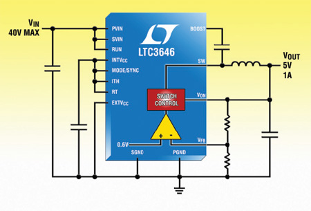 리니어 테크놀로지는 40 V 입력이 가능한 동기식 벅 컨버터(제품명 : LTC3646)를 출시했다. 이 제품은 3 mm x 4 mm DFN-14(또는 열 성능이 강화된 MSOP16) 패키지에서 최대 1 A 연속 출력 전류를 제공할 수 있다. 이 제품은 4 V ~ 40 V의 입력 전압 범위에서 동작하며, 소형 솔루션 풋프린트를 겨냥해 고전압 입력 성능, 고효율, 고속 스위칭 주파수가 필요한 자동차 및 산업용 애플리케이션에 이상적이다. LTC3646은 스위칭 주파수를 2 MHz 이상으로 설정해도 36 V에서 3.3 V로 스텝다운할 수 있는 독자적인 제어형 온타임 아키텍처를 사용해 AM 라디오와 같은 결정적인 주파수 대역에 스위칭 잡음에 의한 영향을 주지 않는다. 또한 10% 미만의 듀티싸이클에서도 매우 빠른 과도 응답을 제공할 수 있다. 내장된 동기식 정류는 95%로 높은 효율을 제공하며 140 μA에 불과한 대기 전류만 요구해 배터리 동작시간을 최대화시킨다. LTC3646은 내장된 하이사이드와 동기식 전력 스위치를 이용해 최대 1 A의 고효율 출력을 제공한다. 이 제품에 내장된 스위칭 주파수는 200 kHz 및 3.0 MHz 사이에서 프로그램할 수 있거나 외부 클록으로 동기화할 수 있다. LTC3646은 잡음에 민감한 애플리케이션의 경우, 전압 리플을 최소화하기 위해 강제적인 연속 동작 모드로 사용될 수 있다. 표준형 LTC3646은 2.0 V ~ 30 V의 출력 범위를 제공하는 반면, LTC3646-1은 0.6 V ~ 15 V에서 출력을 제공한다. 두 가지 버전 모두는 내장형 소프트스타트, 보상 회로 내장, 견고한 단락회로 보호 기능을 포함해 추가적인 기능을 제공한다.