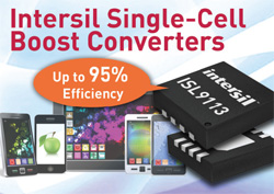 인터실은 뛰어난 출력 밀도와 효율성을 제공하는 부스트 컨버터군을 출시했다. 새롭게 선보인 부스트 컨버터는 USB OTG(on-the-go) 기능을 포함해 단일 셀 리튬 이온 배터리 제품에 유용할 것으로 기대된다. ISL9113은 460 mA/㎟의 높은 출력 전압을 제공하는 집적 동기식 부스터 컨버터로 5 V의 고정 출력 전압뿐만 아니라 가변 출력에서도 사용 가능하다. 또한 1.3 A 집적 동기식 MOSFET은 단일 셀 리튬 이온 배터리의 500 mA에서 5 V를 제공해 태블릿 PC나 스마트폰 USB 포트에 연결된 전원 외부 주변장치에도 유용하게 적용된다. 한편 ISL9113은 2 mm x 2 mm 8-리드 소형 DFN 패키지 및 0.8 mm x 1.36 mm 6-범프 WLSCP 패키지 형태로 이용 가능하다.