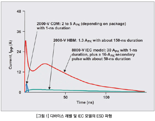 - 시험 중 사용하는 충격 횟수는 모델마다 다르다. HBM은 양극 1회 및 음극 1회 충격만 시험하는 반면, IEC 모델에서는 양극 10회 및 음극 10회 충격을 사용한다. 첫 번째 충격을 견딘 디바이스가 첫 번째 충격에서 입은 피해로 인해 후속 충격에 파괴될 수 있다. 그림 1은 CDM, HBM 및 IEC 모델의 ESD 파형 예제를 보여준다. IEC 모델의 펄스가 각 디바이스 레벨 모델의 펄스보다 에너지가 확연히 높다.