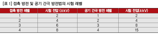 표 1은 각 방법에 대해 IED 61000-4-2가 규정한 시험 레벨 범위를 나타낸 것이다. 각 시험 레벨의 강도는 두 방법 사이에서 동일하지 않다는 점에 주목해야 한다. 스트레스 레벨은 일반적으로 실패 지점까지 각 방법의 공식 최고 레벨인 레벨 4 이상, 점진적으로 시험한다.