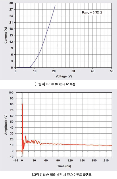ESD는 찰나에 발생하는 이벤트이기 때문에 I/O 라인의 전압은 순간적으로 클램프되지 않는다. 그림 7에서 볼 수 있듯이 IEC 61000-4-2 표준에 따라 수천 볼트의 전압이 수십 볼트로 클램프된다. 식 1에서 RDYN이 낮을수록 클램프 성능이 우수하다.