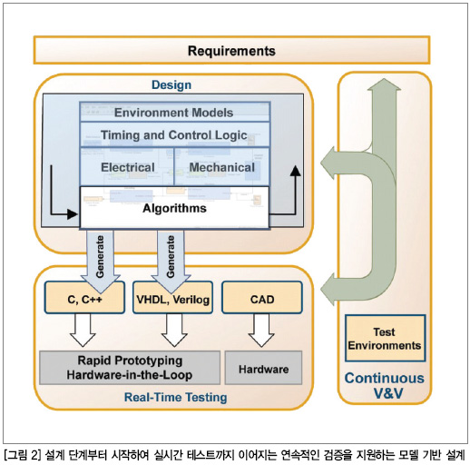 모델 기반 설계는 시뮬레이션과 초기 검증을 통해 이러한 문제를 완화한다. 이 경우 검증은 더 이상 최종 단계가 아니다. 대신 설계 시뮬레이션과 함께 시작하고 실시간 테스트가 뒤따르는 지속적인 과정이 된다(그림 2 참조).