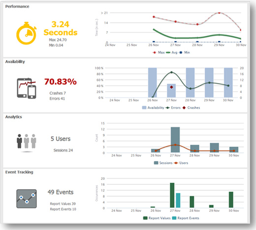 - 실제 사용자의 모바일 애플리케이션 성능 모니터링: 컴퓨웨어 APM 모바일 애플리케이션 모니터링 무료 버전은 애플리케이션 사용 및 성능, 가용성, 비즈니스 관련 정보를 모니터링하고 추적하며, 단일 솔루션에서 모바일 애플리케이션 오류 내역을 탐지하는 업계 유일의 솔루션이다. 무료 버전을 이용해 몇분 이내에 iOS 및 안드로이드 모바일 애플리케이션을 전체적으로 모니터링 할 수 있도록 지원한다.