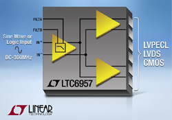LTC6957은 로직 레벨 신호까지 신호 유형을 변환시키기 위해 사용될 수 있으면서, 사인파에특히 뛰어난 성능을 제공한다. 선택형이면서, 대역 제한이 있는 입력단은 가장 낮은 가산 지터로 최적의 사인파 변환을 실현시킨다. 이 디바이스는 보드 수준의 동기화에서 시스템 클록 레퍼런스를 분배할 수 있는 시스템에 이상적이다. 이 제품은 최대 300MHz의 클록 속도를 이용해 ADC(analog-to-digital converter), DAC(digital-to-analog converter), DDS(direct digital synthesis) IC를 위한 클록 드라이버로 사용될 수도 있다.