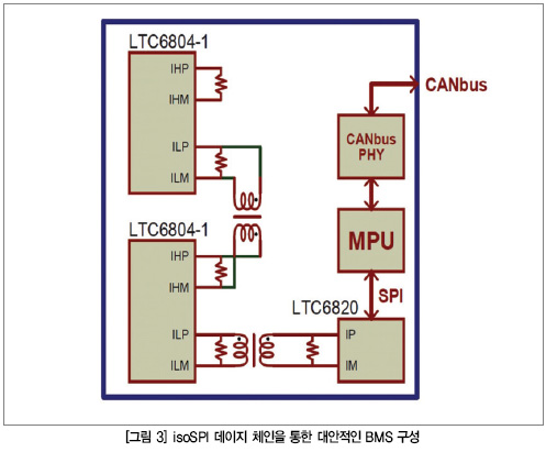 isoSPI 링크는 물론 간단한 P2P(point-to-point) 연결을 통해서도 잘 동작하며, 그림 3에 나타낸 바와 같이 듀얼-포트 ADC 디바이스(LTC6804-1)는 완전 절연 데이지-체인 구조들을 형성할 수도 있다. 버스 또는 데이지-체인 접근법은 유사한 전체적인 구조 복잡성을 포함하고 있기 때문에, 실질적인 설계 측면에서는 포함된 미묘한 세부 요소들에 따라 어느 하나만을 선호할 수 있다. 데이지 체인 방식은 어드레스 설정이 필요 없고 일반적으로 보다 간편한 트랜스포머 결합을 포함하고 있기 때문에 다소 비용 면에서 유리하지만, 병렬 버스가 보다 우수한 내고장성을 제공한다.