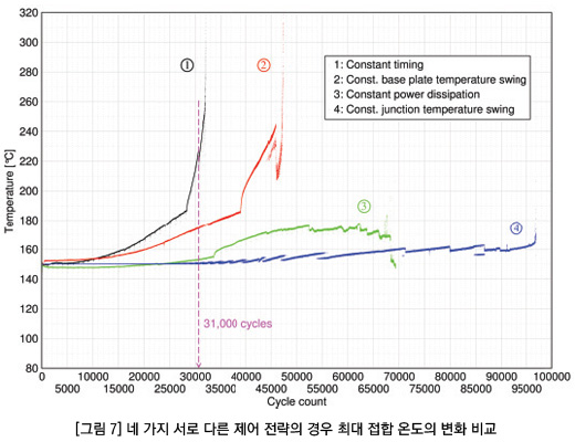 그림 7은 네 가지 제어 전략 모두에 대해 파워 사이클링 테스트 중 주기 수 대비 최대 접합 온도의 변화를 비교하여 보여준다. 곡선은 또한 고장까지의 주기 수를 표시한다.