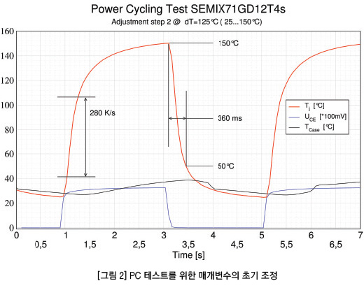 모든 테스트 매개변수는 동일한 시작 조건이 유지되도록 반드시 주의해서 조정해야 한다. 개별 테스트 샘플은 각각 조금 다른 열저항 Rth(j-c) 및 VCE 값을 보유하므로, 이 값들을 가능한 한 가깝게 조정하기 위해 게이트 전압 VGE 제어를 적용한다(그림 2).
