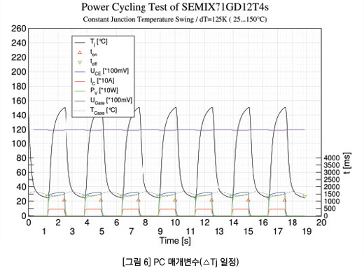 안정화가 지속되고 나면 열저항 Rth(j-c)의 측정과 함께 자동화된 절차가 시작된다. 그 다음, 차기 파워 사이클 100주기 동안의 모든 다른 매개변수를 통계적으로 평가했다. 이 결과를 기초로, 온도 중간값 Tm = 87.5 ℃에서 온도 변동 △Tj = 125 ℃가 되도록 초기 매개변수를 조정했다. 일정한 DC 전류는 Infineon 4세대 IGBT(9.1 × 7.7 mm2)와의 모든 테스트에 대해 Ic = 85 A로 고정됐다.