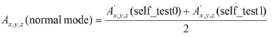 정상 모드(셀프 테스트를 수행하지 않는)에서의 가속도 센서 로우 데이터는 셀프 테스트 0의 로우 데이터와 셀프 테스트 1의 로우 데이터 자료를 합한 총합의 절반과 같다. 이는 셀프 테스트 0 모드와 셀프 테스트 1 모드에서의 Δ 값이 상쇄되기 때문이다. 말하자면 다음과 같이 나타낼 수 있다.