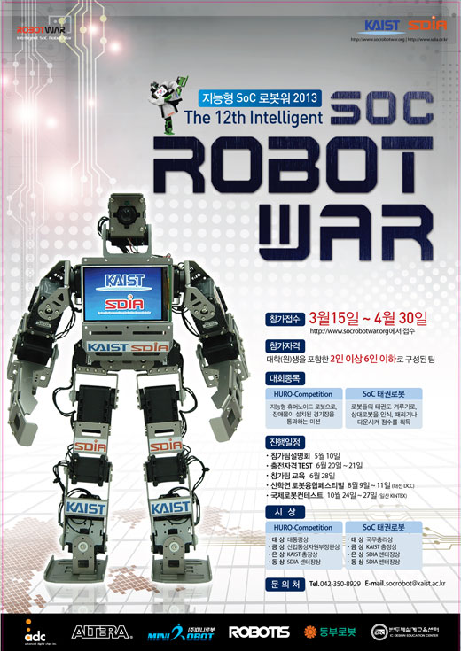 지능형 SoC 로봇워는 매년 약 80여 개 대학, 150여 팀, 600명 이상의 학생들이 참가하며 대학(원)생을 포함한 2인 이상으로 구성된 팀이면 누구나 참가가 가능하며, 참가팀들에게는 로봇과 지능로봇 플랫폼 보드에 대한 이론 및 실습교육에 참가할 자격이 주어진다. ‘지능형 SoC 로봇워’는 HURO-competition, SoC태권 로봇의 두 가지 종목으로 구분되어 있다. 알테라는 참가신청 후 종목별로 실시되는 출전자격 테스트를 통과한 본선 진출팀들에게 지급되는 개발보드에 탑재될 Cyclone® FPGA와 configuration 부품 일체를 제공한다. 알테라는 또한 10월의 본선대회에서 입상한 8개 팀들에 대해 입상한 팀 소속 대학 연구실에 DE-nano 보드도 기증하게 된다.