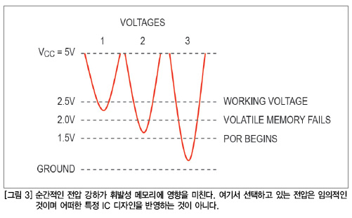 그림 3에서는 드루핑(drooping) 전압 1이 레지스터 설정에 영향을 미치지 않는다는 것을 알 수 있다. 이 전압은 메모리가 소실되는 2 V보다 낮게 떨어지지 않았다. 전압 2는 2 V선 아래로 떨어지므로 메모리가 소실된다. 이 전압이 다시 상승했을 때는 휘발성 레지스터가 랜덤 데이터를 포함하고 있을 것이다. 끝으로, 전압 파형 3은 2 V를 지나서 계속해서 1.5 V보다 낮게 떨어지므로 휘발성 메모리가 소실된다. 그러다가 이 전압이 1.5 V로 상승하면 POR이 스타트하고 휘발성 메모리가 NV 메모리로부터 리플래시되고 부품이 정상적으로 동작할 것이다.