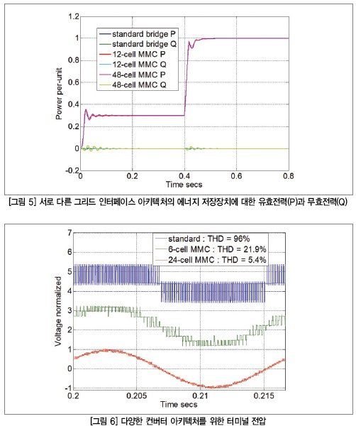 그림 5는 에너지 스토리지 시스템에 대한 인터페이스로 표준 6-디바이스 IGBT 브리지와 6-cell 및 24-cell(per-phase) IGBT MMC(Modal Multilevel Converter)를 비교하는 시뮬레이션 연구에서 유효 및 무효전력 출력을 보여준다. 해당 시스템은 0.4초에 유닛당 유효전력 0.3에서 유닛당 유효전력 1.0으로 이동하는 한편, 무효전력을 0으로 조절하도록 지시되었다. 그림 5의 시뮬레이션 결과를 통해 서로 다른 전력 전자 아키텍처 포함으로 피드백 시스템의 참조 추적 기능이 손상되지 않음을 분명히 알 수 있다. 그림 6은 각 아키텍처에 대한 컨버터의 출력에서 전압 파형을 표시한다. 그림 6에서는 또한 전압 파형의 THD(Total Harmonic Dis-