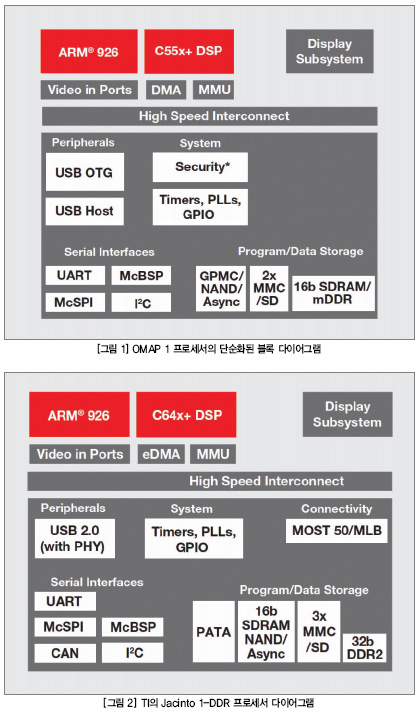 Jacinto 1 디바이스는 TI C64x+ 고정소수점 DSP로 C55x DSP를 대체하기도 했다. C64x+DSP의 성능을 통해 그래픽 가속, 압축 오디오 디코딩, 음성인식, 무선 복조를 동시에 실행할 수 있게 됐고, 이로 인해 단일 독립 ARM CPU로 수행할 수 있는 작업의 범위가 크게 확대됐다.