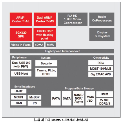 소프트웨어를 통한 혁신적인 도약도 이루어졌다. Jacinto 3 디바이스를 사용하면 단일 칩에서 인포테인먼트 소프트웨어 전체를 실행할 수 있었다. 마침내 시스템을 구동하기 위해 별도의 CPU, GPU 및 DSP 부품을 몇 개씩이나 갖추지 않아도 되는 시대가 온 것이다. QNX 소프트웨어 시스템즈는 Jacinto 3의 기능과 지난 10년간의 오토모티브 기술 발전을 활용해 첫 번째 QNX CAR™ 애플리케이션 플랫폼을 개발했고, 이 플랫폼은 오토모티브 인포테인먼트 제품을 위한 초기 단계의 통합에 따른 어려움을 상당히 줄여줬다. QNX CAR 애플리케이션 플랫폼은 모든 별도의 소프트웨어 구성요소를 ‘현대적인’ 인포테인먼트 시스템에 필요한 모든 기능을 포괄하는 하나의 패키지로 통합했다. 모든 인포테인먼트 기능을 하나의 칩이 가지고 있는 단일 소프트웨어 아키텍처에 통합시킴으로써 프로젝트의 BOM 비용이 절감됐고 사전 통합 소프트웨어 구성요소는 개발비용을 감소시켰다.