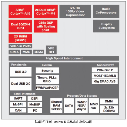 Jacinto 6 플랫폼은 다중 카메라 입력과 적응형 순항 제어(Adoptive Cruise Control, ACC), 차선 이탈 경고(Lane Departure Warning, LDW), 졸음운전 경고와 기타 다양한 기능에 사용되는 카메라를 포함하고 있어서 설계자가 ADAS(Advanced Driver Assistance and Safety) 기능을 지원하는 인포테인먼트 시스템을 개발할 수 있게 해준다. 여러 가지 버전의 QNX짋 Neutrino짋 RTOS가 신뢰도 높은 시스템에 대한 세이프티 인증을 획득했기 때문에 OMAP 5 프로세서, QNX 인포테인먼트, ADAS를 조합한 시스템은 업계의 요구조건을 충족하여 보다 진보된 멀티미디어 기능과 안전 기능을 통합함과 동시에 비용을 줄일 수 있을 것이다.