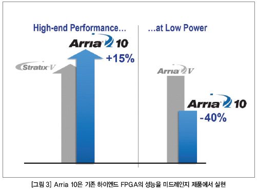 Arria 10 FPGA/SoC 제품군은 최저 미드레인지 전력 조건에서 기존 하이엔드 FPGA의 성능과 기능을 모두 제공함으로써 미드레인지 프로그래머블 디바이스에 대한 새로운 표준을 제시했다고 할 수 있다.