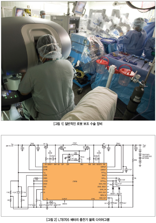 로봇 수술 시스템은 다양한 형태의 최소 침습 대수술을 지원해 입원 기간을 단축하고 일상으로 보다 빠르게 복귀할 수 있도록 해주며 보다 우수한 임상 결과를 제공할 가능성을 제공한다. 분산 전력 아키텍처를 통해 이러한 시스템에 전력을 공급함으로써 48 V 일반 배터리를 사용하여 모든 서브시스템을 위한 다운스트림 POL(point-of-load) 레귤레이터에 전력을 공급하는 버스 전압을 백업할 수 있다. 리니어 테크놀로지의 LT8705 동기식 벅-부스트 DC/DC 컨트롤러는 입력 전압과 같거나 또는 높거나 낮은 부동 전압을 통해 배터리를 효율적으로 충전시킬 수 있기 때문에 전력공급장치 설계를 대폭 단순화시킬 수 있다. ES