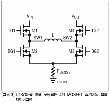 그림 3은 4개의 전력 스위치를 인덕터, VIN, VOUT, 그라운드에 연결하는 방법에 대한 블록 다이어그램을 나타낸 것이다.