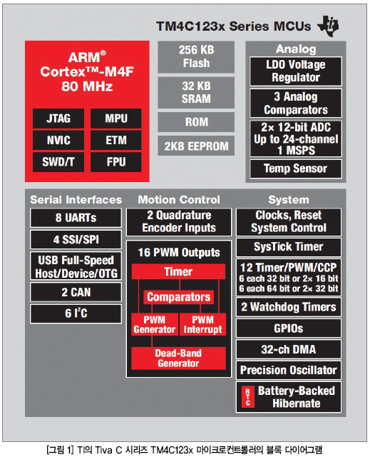 이제 TI의 MCU 카탈로그에 포함된 새로운 Tiva C 시리즈 MCU는 TI의 이미 MSP와 C2000™ MCU로 그 우수성이 입증된 TI의 발전과 기술을 온전히 활용한 제품이다. 혼성신호 회로 및 메모리 구조 같은 일부의 경우, 특정 회로를 타깃으로 했다. 한편, 공격적인 프로세스 기술은 보드의 전력소비를 감소시켰다. Tiva C 시리즈 MCU는 TI의 축적된 기능 향상과 기술 진보의 결과라고 할 수 있다.