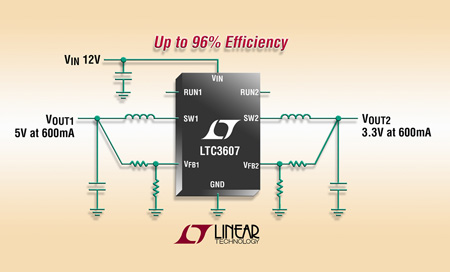 리니어 테크놀로지 코리아(대표 홍사곽)는 피크 전류 모드 아키텍처에 통합된 고효율, 2.25MHz 동기식 듀얼 출력 벅 레귤레이터(제품명: LTC3607)를 출시했다고 밝혔다. 이 제품은 3mm x 3mm QFN이나 열 성능이 강화된 MSOP-16 패키지에서 최소 0.6V까지의 낮은 출력 전압과 각 채널은 최대 600mA 연속 출력 전류를 제공할 수 있다. LTC3607은 4.5V ~ 15V의 입력 전압 범위를 수용하여, 듀얼 셀 리튬이온 애플리케이션뿐 만 아니라 5V 및 12V 중간 버스 시스템에 이상적이다. 2.25MHz의 고정 스위칭 주파수는 동기화가 가능하며 작은 크기로 저가형 커패시터 및 인덕터를 사용할 수 있게 한다.