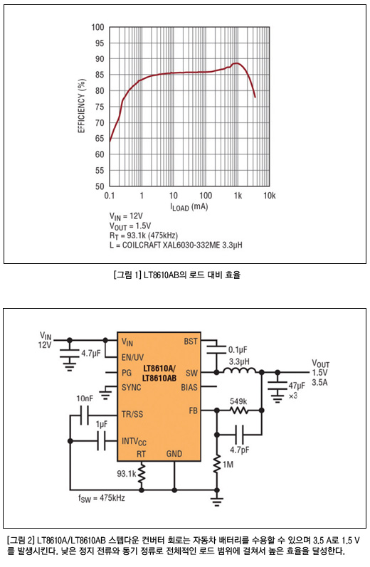 LT8610A와 LT8610AB는 자동차 시스템에 이용하기에 적합하도록 설계된 모놀리식 동기 스텝다운 레귤레이터이다. 이들 디바이스 제품은 3.5 A를 공급할 수 있으며 2.5 μA 정지 전류만을 소모한다. 이들 제품을 이용함으로써 간편하게 회로를 구현할 수 있다. 추가적인 반도체를 필요로 하지 않으며 저가의 세라믹 커패시터를 이용할 수 있고 MSOP 패키지로 리드를 제공하므로 솔더링과 검사가 용이하다. 정격 최소 온-시간이 30 ns(최대 45 ns 보장)이므로 높은 스텝다운 비율로 콤팩트한 고주파 스위칭 주파수 벅 레귤레이터를 설계할 수 있다. 그림 2는 1.5 V로 3.5 A를 공급하는 애플리케이션을 보여준다. 동작 주파수는 475 kHz로서 효율을 극대화하고 AM 라디오 대역보다 낮도록 한다.